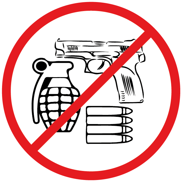 Fuochi artificiali, petardi, munizioni, polvere da sparo, bengala. Pistole, fucili ad aria, pistole, fucili, armi replica (compresi i giocattoli), coltelli, munizioni.Fosforo, carbone, Diossido di carbonio solido (ghiaccio secco).